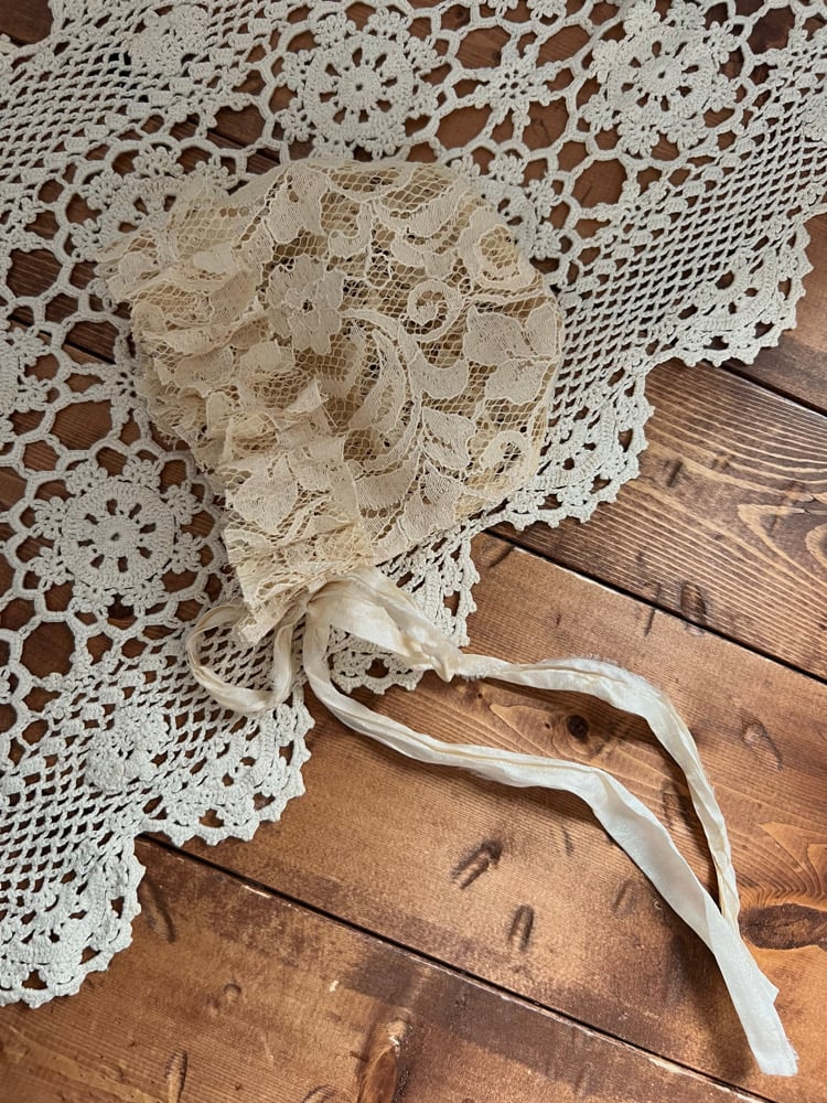 Antique Beige Lace Newborn Bonnet Silk Tie